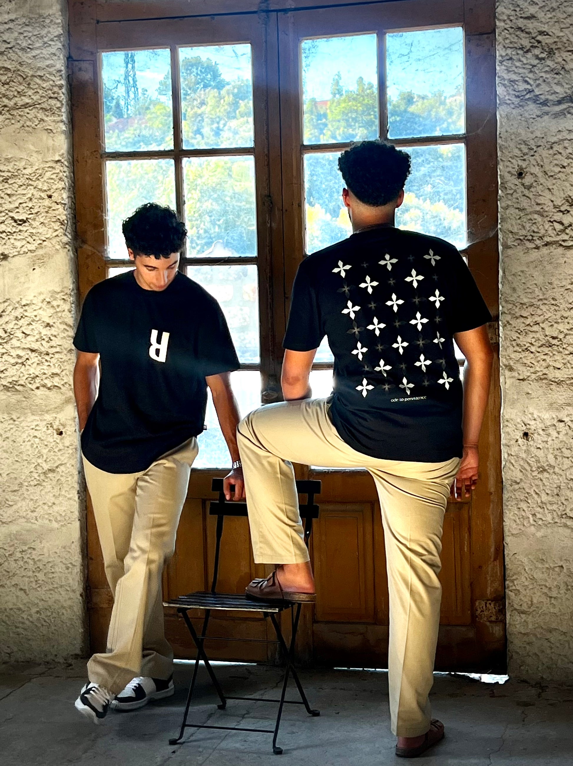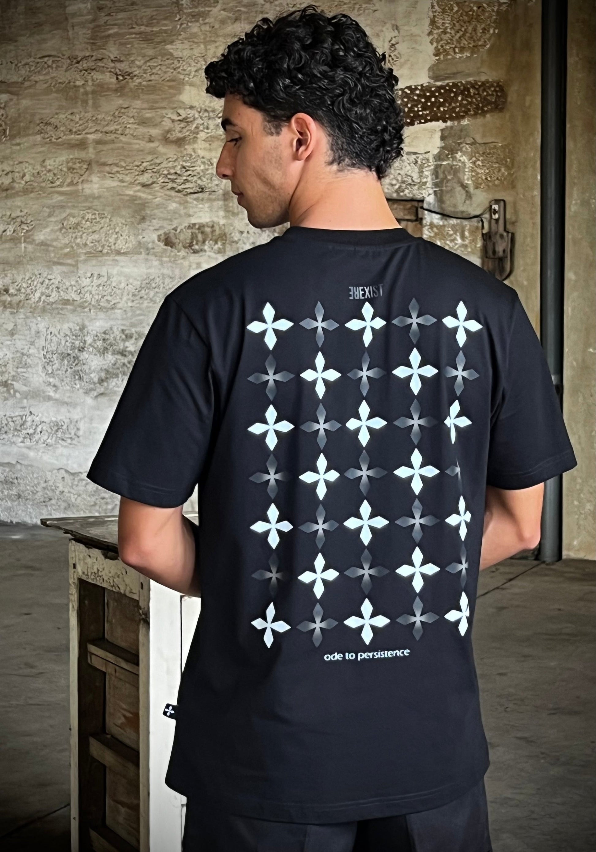 THE ODE TO PERSISTENCE é uma homenagem à resiliência e à determinação. O padrão grande de cruzes preto e branco simboliza a força que vem da repetição, da consistência, da persistência.